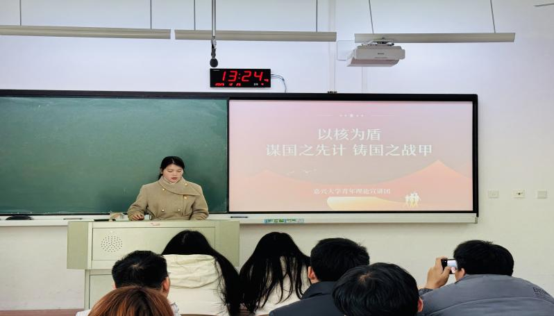 肖明雨同学回顾了“两弹一星”元勋程开甲的奋斗足迹,诠释科技自立自强的精神传承。她号召青年在课堂学习、科研实践与学术交流中筑牢使命意识,为2035年基本实现社会主义现代化的目标贡献青春智慧。