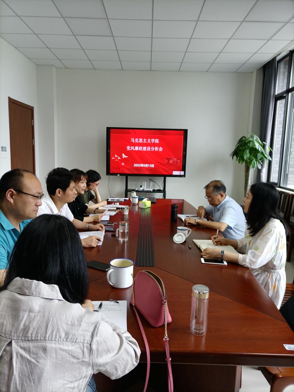 在厚德楼346会议室召开了2022上半年党风廉政建设情况分析会。嘉兴学院党委副书记钱方明、校纪委委员杨芬芬到会指导。本次会议由学院直属党支部书记宋之霞主持,学院党政领导班子成员和支委委员参加会议。