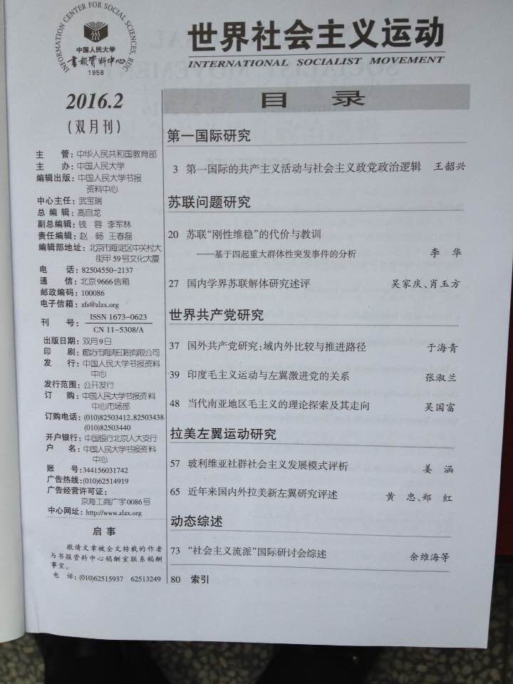 我部李华教授在黑龙江省社会科学院主办《西伯利亚研究》2015年第5期发表的《苏联“刚性维稳”的代价与教训——基于四起重大群体性突发事件的分析》一文(10000字),被中国人民大学《世界社会主义运动》(国家一级期刊)2016年第2期全文复印转载。