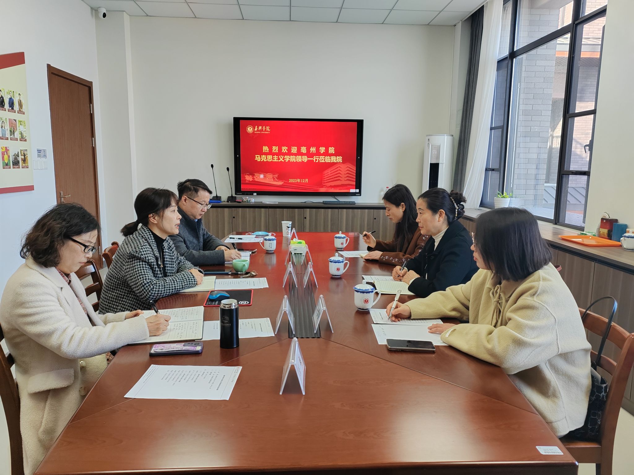 12月8日上午,亳州学院马克思主义学院院长张慧芳一行3人到童颜巨乳 交流座谈。童颜巨乳 书记宋之霞、副院长许惠芬、办公室主任余珊珊及部分专任教师参加了座谈。