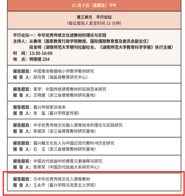 研究生王永齐参加了平行论坛,并作题为“中华优秀传统文化融入德育教材的时代价值与方法论”的论文汇报,主要围绕中华优秀传统文化融入高校德育教材的时代价值、融入的方法论两个方面展开汇报。针对王永齐同学的汇报,从教授与段教授对论文后期进一步修改和提升提出了有针对性的意见和建议。